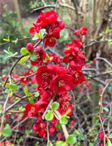 The real highlight of the garden this month are definitely the Chaenomeles cathayensis and C. japonica, commonly know as ornamental quince. We have numerous specimens throughout the garden and many glorious colours, ranging from red, through orange and into a lovely coral pink. We also have a pure white variety which in addition to making handsome shrubs is trained up and onto the outside wall of the cycle gallery. Along with the white quince we also have a beautiful white camelia. The blooms are spectacular, but don’t last long in harsh weather some come and see them while you can. Continuing the white theme, our Osmanthus x burkwoodii is also in bloom, producing a delicious scent.
